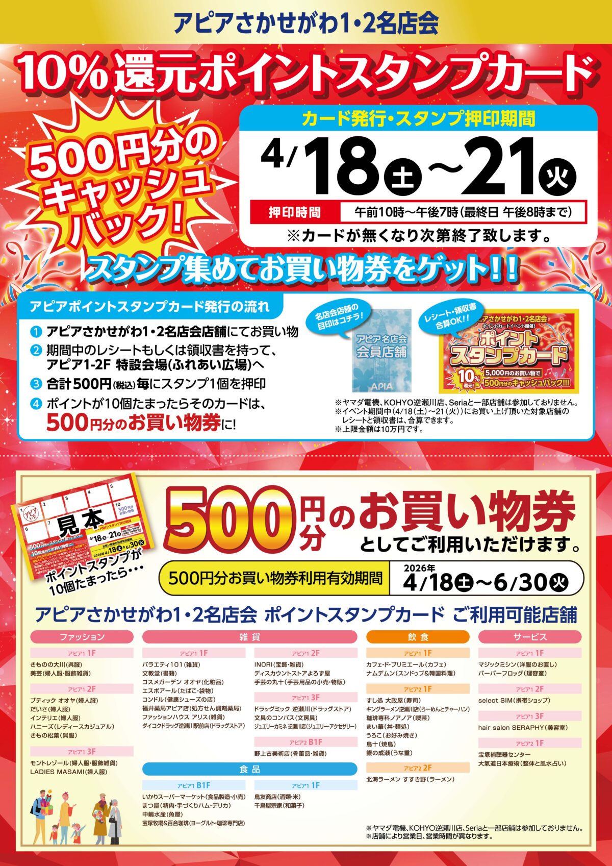 お持ち頂きますと、500円(税込)毎に1スタンプ押印致します。